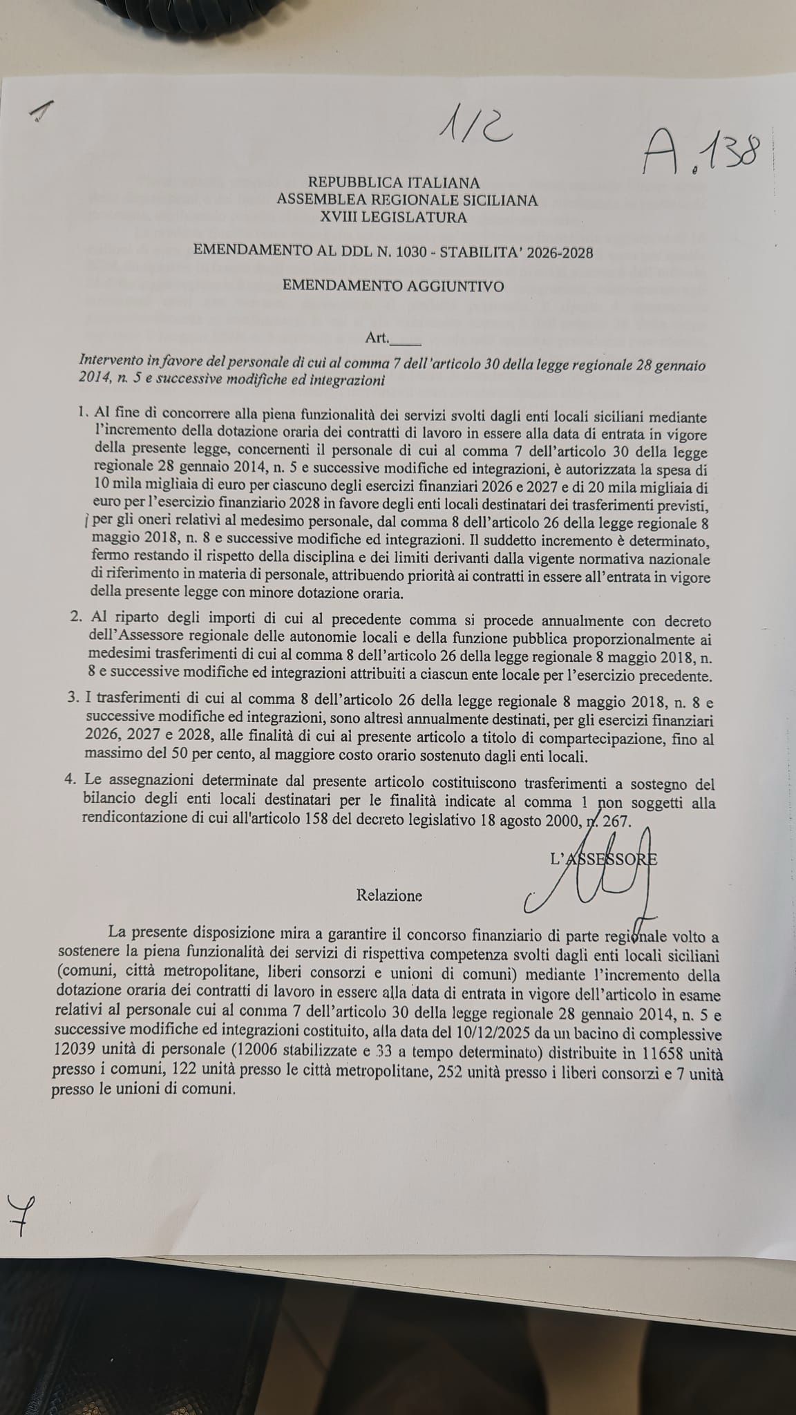 L'ARS fra mille tensioni interne alla maggioranza, ha licenziato nella tarda notte la legge finanziaria 2026, contemplando nel suo articolato l'approvazione della norma per la quale da mesi ci siamo spesi come Segreteria Regionale Dipartimento Poltiche Attive del Lavoro e del Precariato CSA/RAL, con l'apporto fondamentale di Amministratori Locali, che con la loro importante presenza in due precisi momenti istituzionali da noi convocati, presso la sala Pier Santi Mattarella lo scorso 4 Giugno e presso la sala rossa il 25 Novembre u.s., hanno testimoniato la necessità di un intervento legislativo sull'aumento delle ore al personale contratualizzato ed in servizio con rapporti di lavoro a tempo indeterminato e partime presso le medesime amministrazioni locali per sopperire alle reali necessità di garantire l'erogazione dei servizi e al contempo intervenire a favore del personale rivendicando la ricontratualizzazione del monte ore settimanale a 36 ai fini di una maggiore copertura previdenziali che abbia ricadute sull'aspetto pensionistico futuro, non tano lontano .